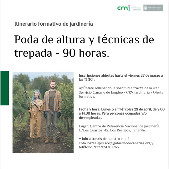 Inscripciones abiertas hasta el viernes 27 de marzo a las 13.30h. Apúntate rellenando la solicitud a través de la web, Servicio Canario de Empleo - CRN Jardinería - Oferta formativa.Fecha y hora: Lunes 6 a miércoles 29 de abril, de 9.00 a 14.00 horas. Para personas ocupadas y/o desempleadas. Lugar: Centro de Referencia Nacional de Jardinería, C/Los Cuartos, 42, Los Realejos, Tenerife.+ info a través de nuestro email cnfo.losrealejos.sce@gobiernodecanarias.org y teléfono: 922 924 163/65